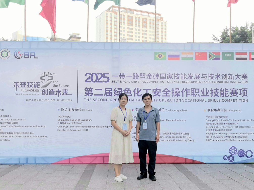 10月16日-20日,2025年一带一路暨金砖国家技能发展与技术创新大赛——第二届绿色化工安全操作职业技能大赛在广西工业职业技术Bwin必赢举行。我院吕奕菊、杨文两位教师参赛,并获得职工组优秀奖。 大赛作为金砖国家框架下的重要技能赛事,致力于推动“一带一路”与金砖国家在绿色化工领域的技术融合与人才共育,助力化工行业安全、绿色、可持续发展。赛事期间,两位老师参观了广西工业职业技术学院化工原理实验装置,此次参赛提升了教师在绿色化工与安全操作方面的教学与实践能力,为培养符合行业需求的高素质化工专业人才积累了宝贵经验。 合影 (一审:杨文 二审:马文硕 三审:李霞)