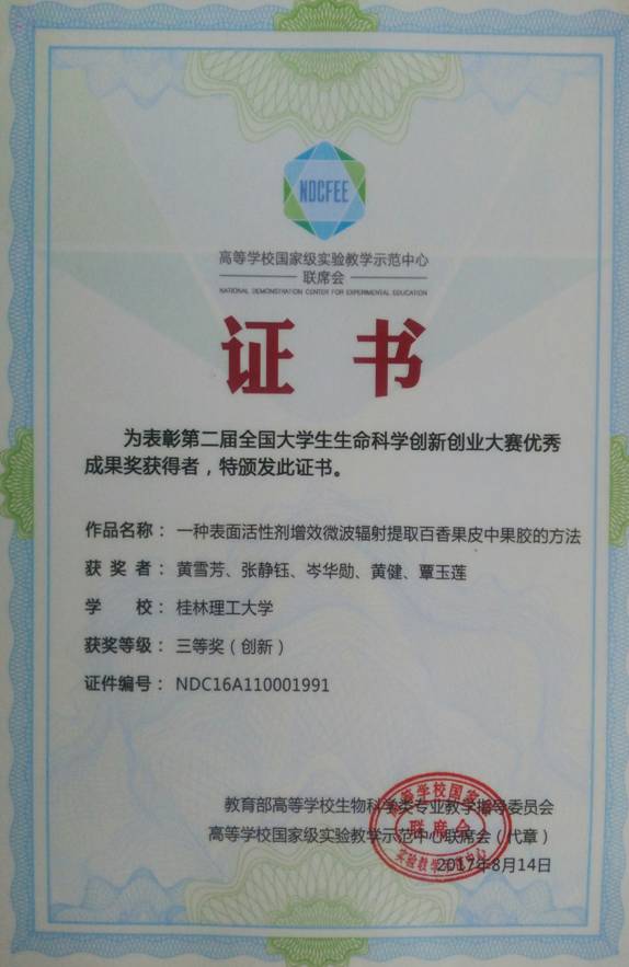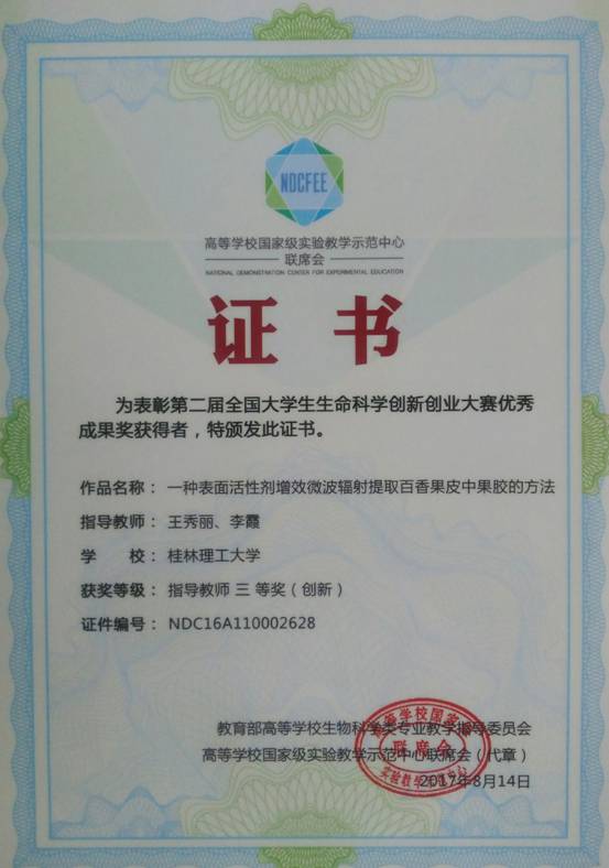 导航痕迹 当前位置: 首页 >> 新闻资讯 >> Bwin必赢新闻 >> 正文 我院学子在“第二届全国大学生生命科学创新创业大赛”中喜获三等奖 作者:王秀丽 发布日期:2017-09-05 浏览次数: 最近,我院生物工程专业学子黄雪芳、张静钰、岑华勋、黄健、覃玉莲等五名同学的发明专利作品——《一种表面活性剂增效微波辐射提取百香果皮中果胶的方法》在“第二届全国大学生生命科学创新创业大赛”中荣获三等奖,指导教师为我院王秀丽高级工程师和李霞副教授。 据悉,“第二届全国大学生生命科学创新创业大赛”由教育部高等学校生物科学类专业教学指导委员、高等学校国家级实验教学示范中心联席会联合主办,由兰州大学承办,本届大赛共收到来自全国173所高校的参赛作品共计733项。我院学子首次参加该项赛事并荣获三等奖。 上一条:深入走访,化生学院扎实做好开学初学生安全稳定工作 下一条:我院召开新学期全院教工会议传达落实学校主要领导讲话精神